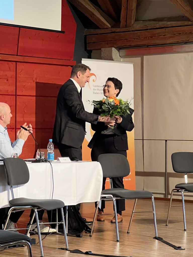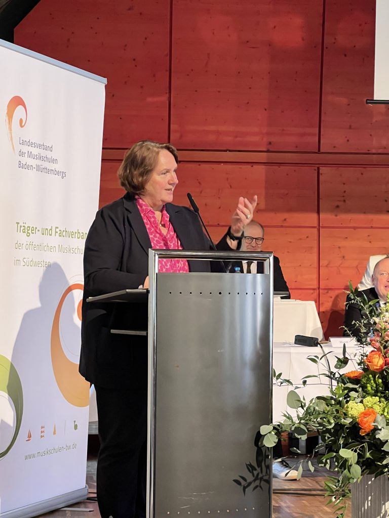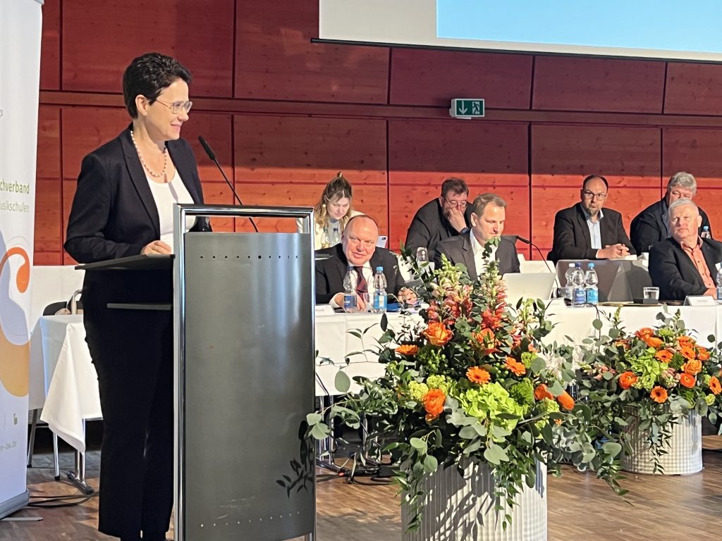 Die Präsidentin des Landesverbandes, Marion Gentges, zog eine Bilanz der zurückliegenden Amtszeit und dankte insbesondere für die verlässliche Zusammenarbeit mit dem Kultusministerium. Wichtige Impulse sieht der Verband im Schülermentorenprogramm EMP/Rhythmik, in der Förderung der studienvorbereitenden Ausbildung sowie in der Mitwirkung am „Runden Tisch Ganztag“. Mit Blick auf den kommenden Rechtsanspruch auf Ganztagsbetreuung betonte Gentges die zentrale Rolle der Musikschulen als außerschulische Partner.