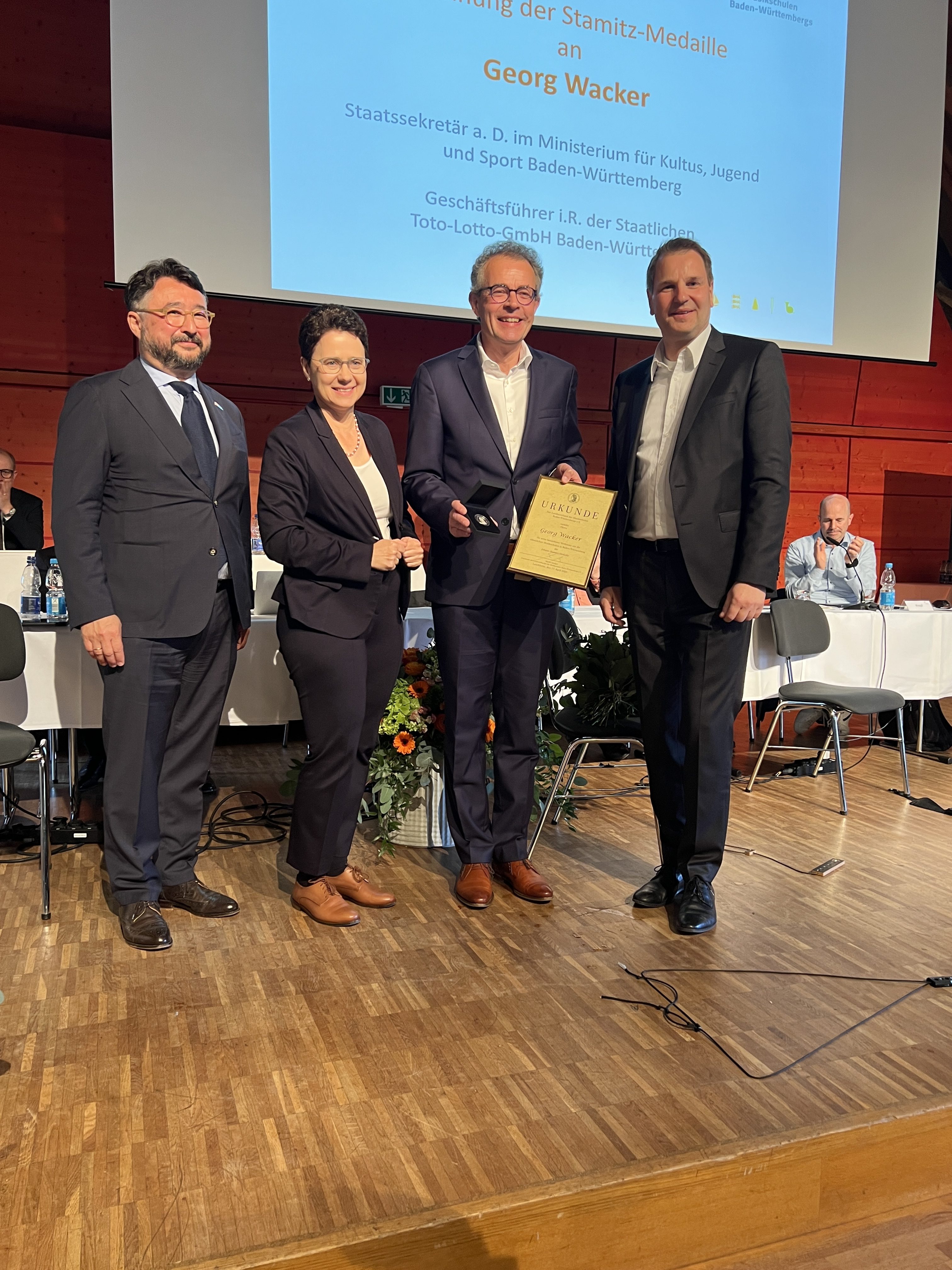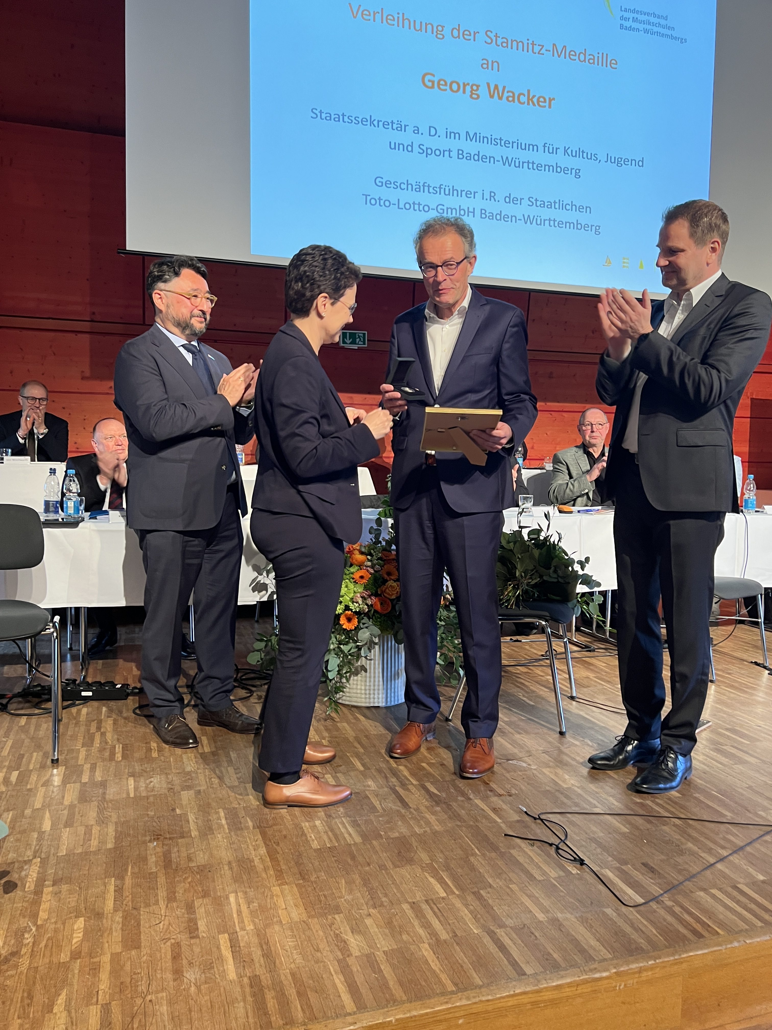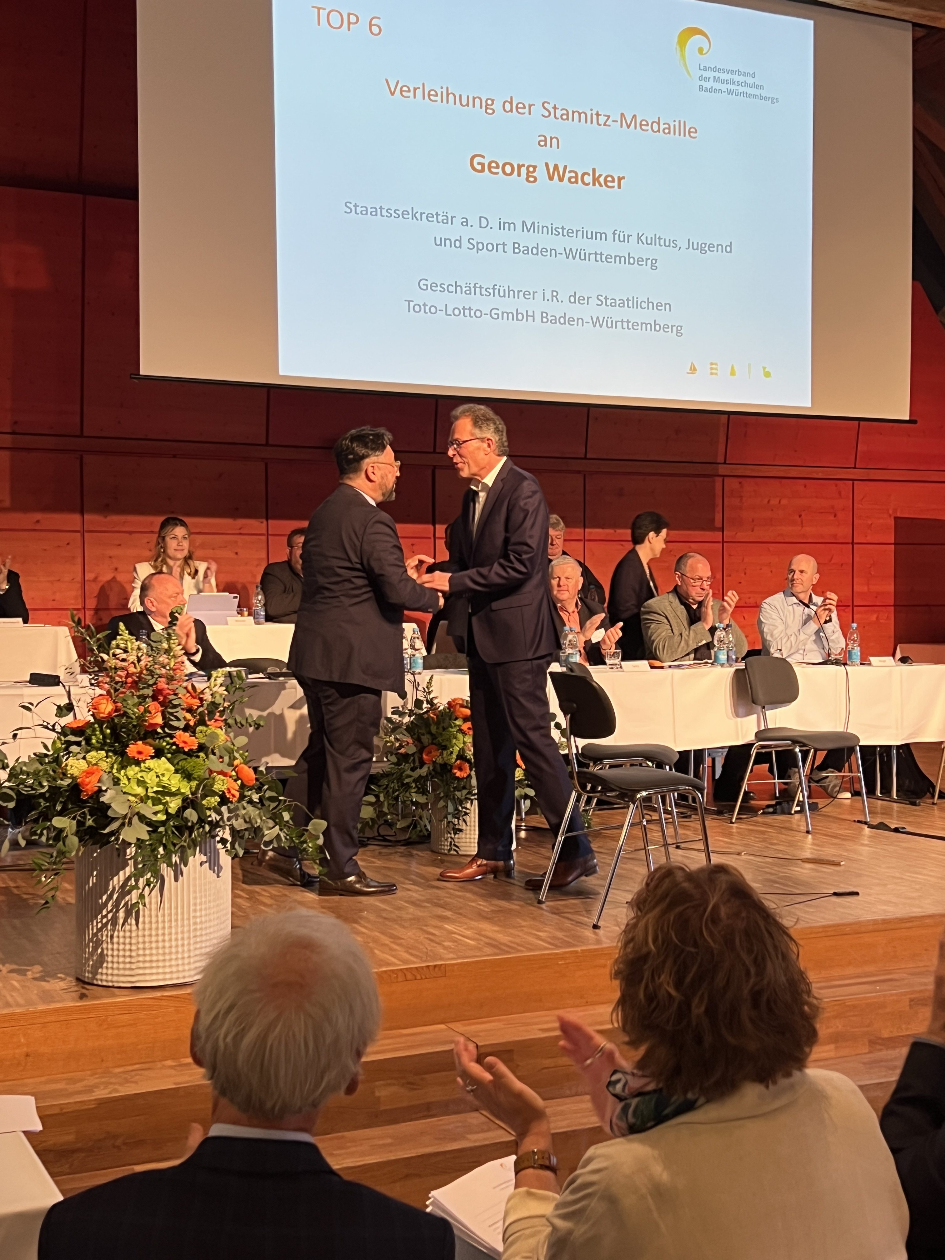 Ein Höhepunkt der diesjährigen Mitgliederversammlung war die Verleihung der Johann-Stamitz-Medaille an Georg Wacker, früherer Staatssekretär im Kultusministerium sowie ehemaliger Geschäftsführer von Lotto Baden-Württemberg, für seine langjährigen Verdienste um die öffentlichen Musikschulen. In seiner Laudatio würdigte Friedrich Koh Dolge, Bundesvorsitzender des Verbands deutscher Musikschulen (VdM) und Ehrenvorsitzender des Landesverbandes Baden-Württemberg, insbesondere Wackers Engagement für die frühkindliche musikalische Bildung sowie für die nachhaltige Förderung der Musikschularbeit im Land: „Wir ehren Sie heute, weil Sie den öffentlichen Musikschulen in Baden-Württemberg in besonderer Weise verbunden sind und waren – aus der Überzeugung, dass musikalische Bildung junger Menschen ein sehr, sehr starker Wert an sich ist.“ Die Auszeichnung würdige zugleich, so Laudator Dolge, „eine Linie seines Wirkens, eine Linie der Zugewandtheit, eine Linie der Verlässlichkeit und eine Linie der bildungspolitischen Verantwortung.“