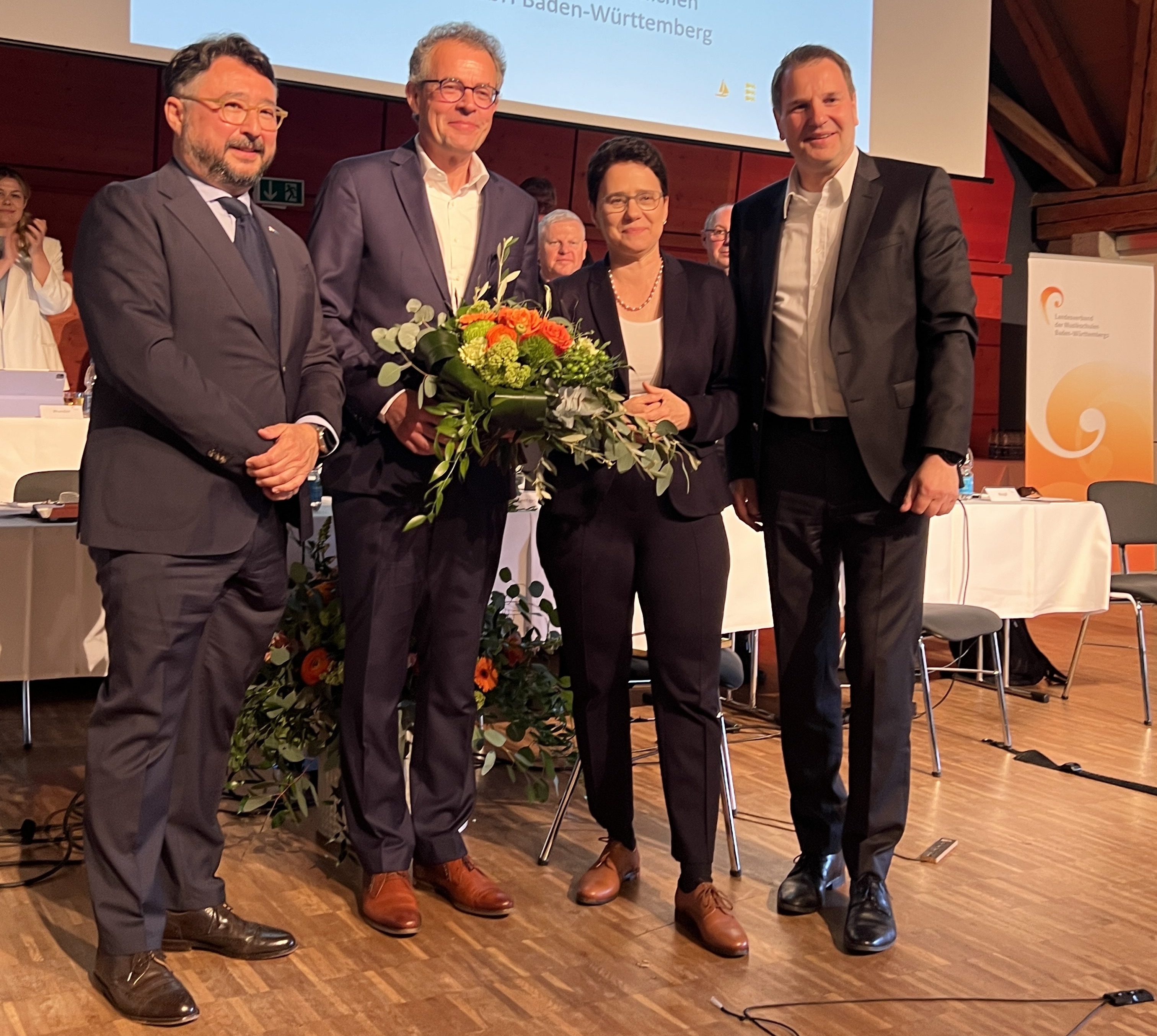Georg Wacker (2. v.l.) wird mit der Johann-Stamitz-Medaille für seine Verdienste um die Musikschulen in Baden-Württemberg ausgezeichnet. Es gratulieren und danken dem Geehrten (v.l.n.r.): Friedrich Koh Dolge, Marion Gentges, Ingo Sadewasser